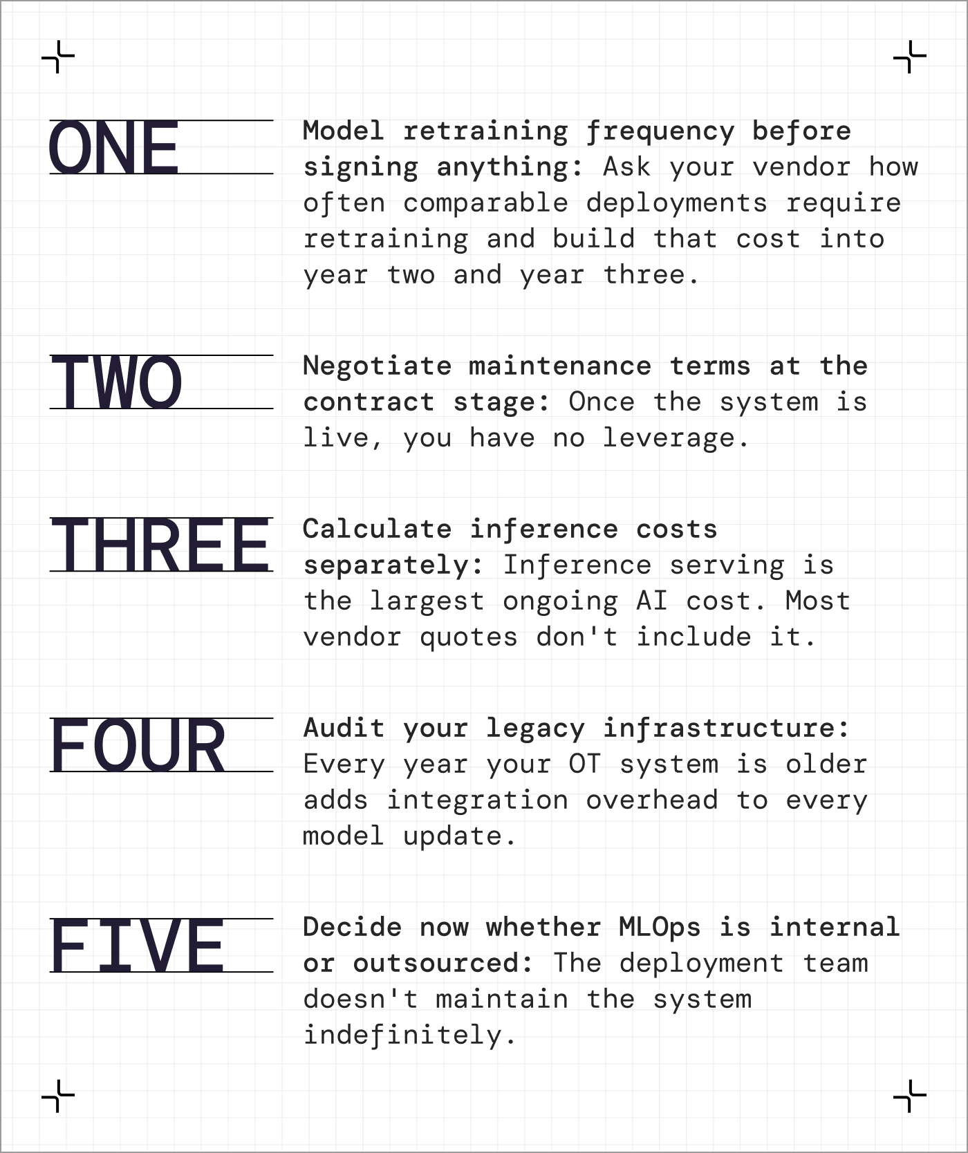 The manufacturers who avoid the situation Ecolab found themselves in ask for retraining frequency estimates upfront, negotiate maintenance terms at the contract stage, and get inference costs as a separate line item before signing.