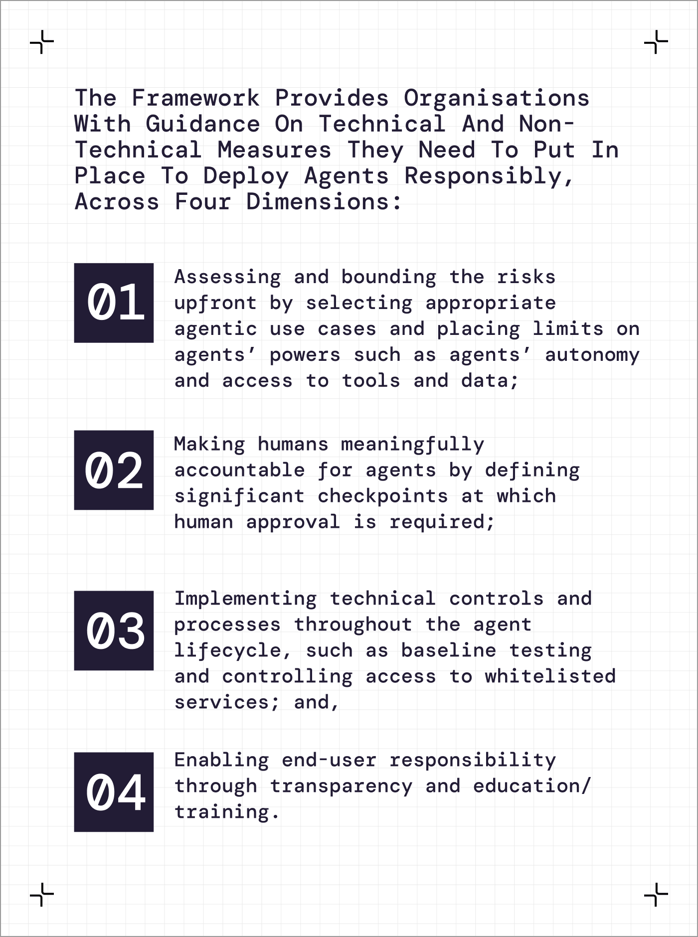 Released January 22, 2026. First dedicated governance model for autonomous AI. Covers bounding risks, distributing accountability, technical controls, and limiting agents to minimum required tools.