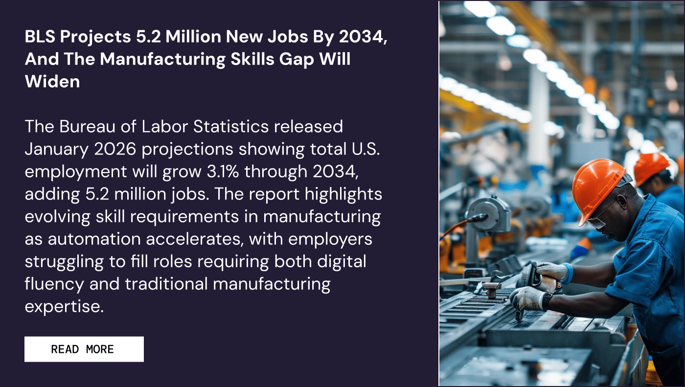 A 2024 Deloitte study projects US manufacturers will need 3.8 million new workers by 2033, and half those jobs may go unfilled.