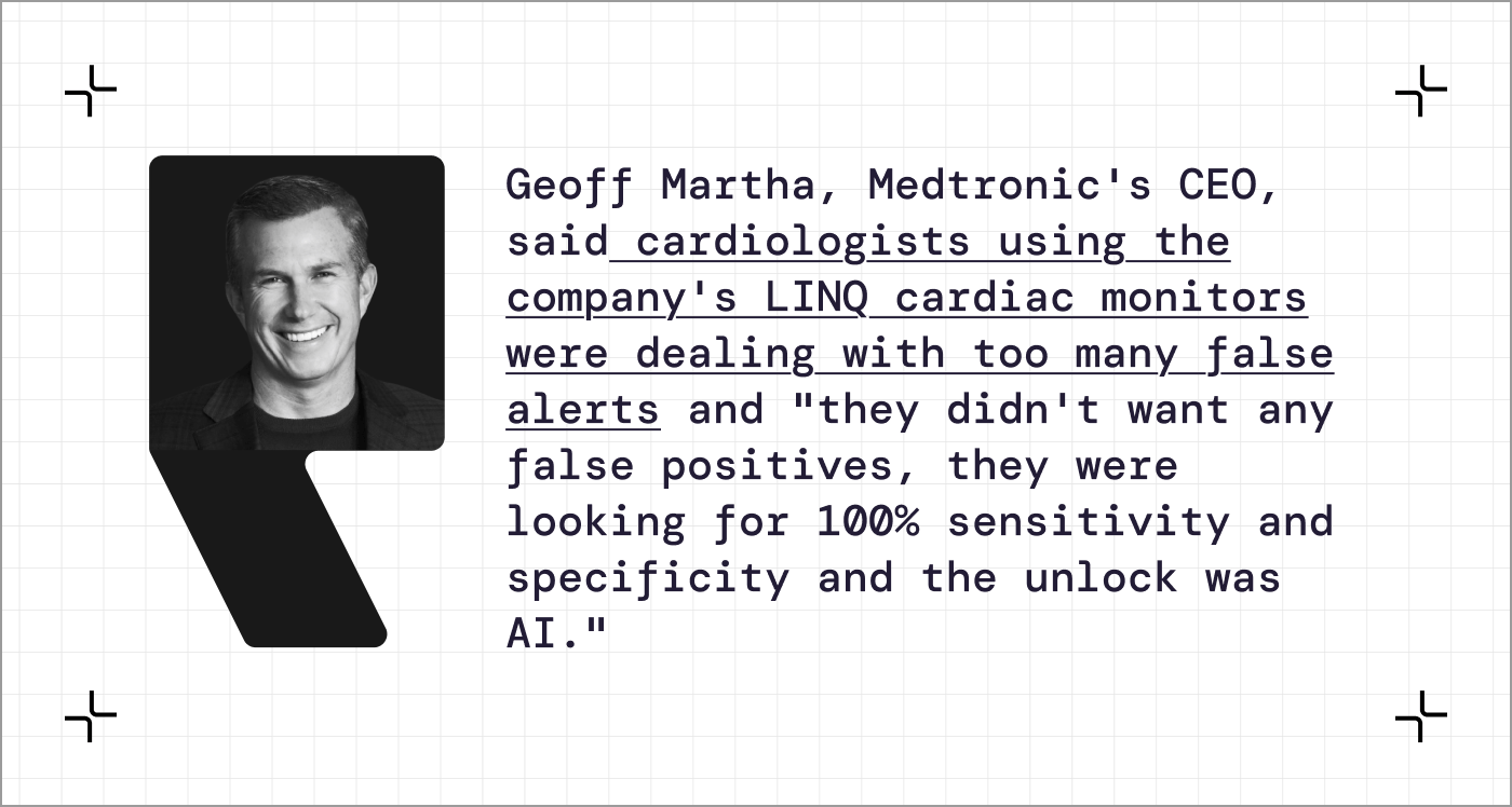 Medtronic deployed AccuRhythm AI algorithms and reduced false alerts from 74.1% to 88.2%.